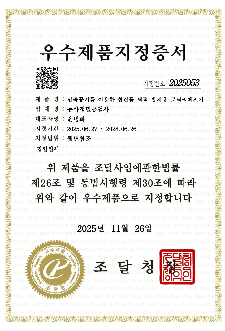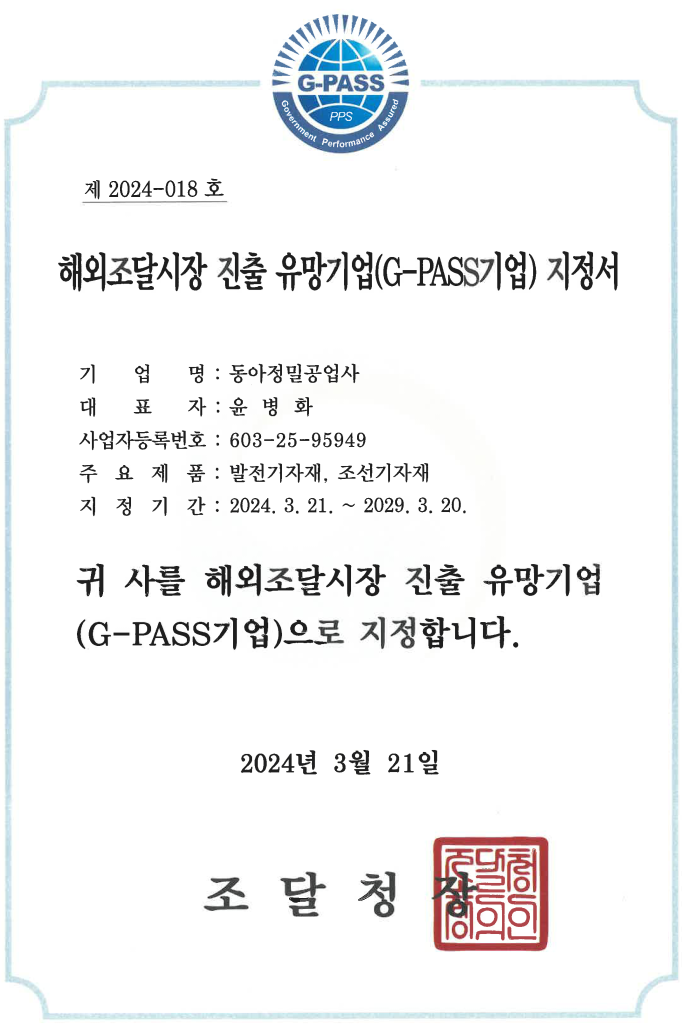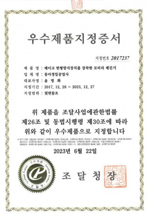 우수제품 지정증서_동아정밀