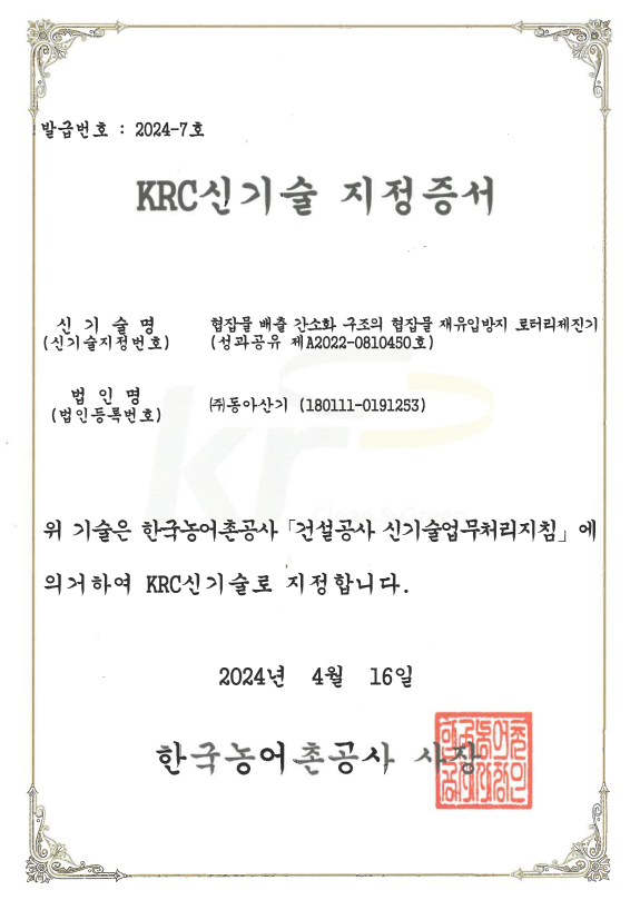 KRC신기술 지정증서