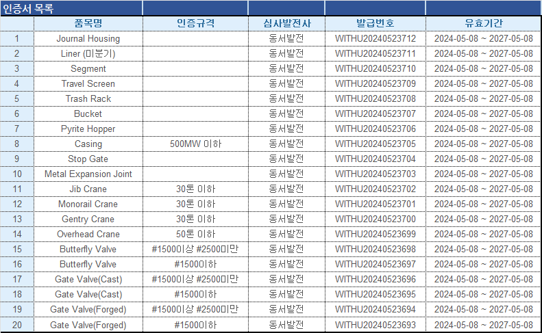 발전회사 정비적격기업 인증서_취수설비_Stop Gate외 19종