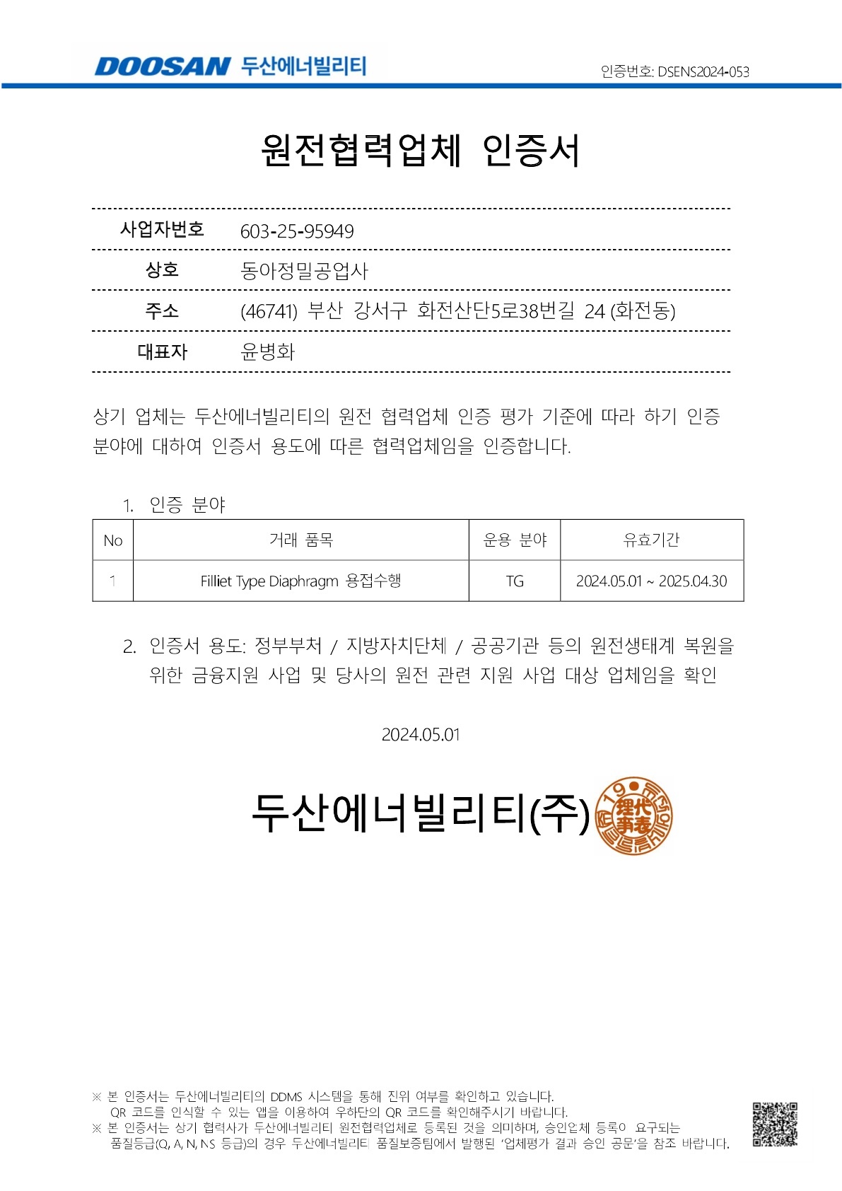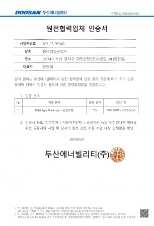 두산에너빌리티 원전협력업체 인증서