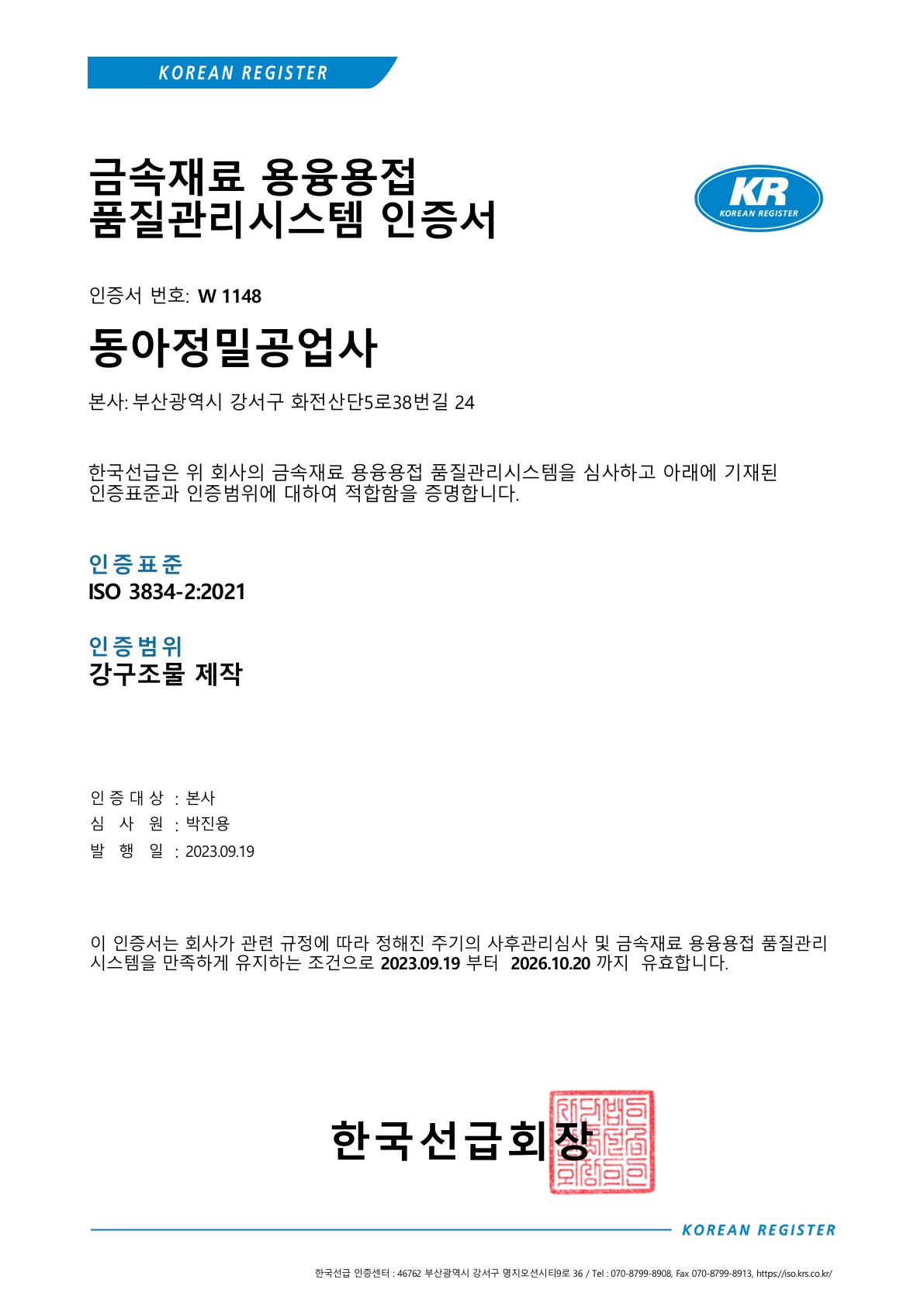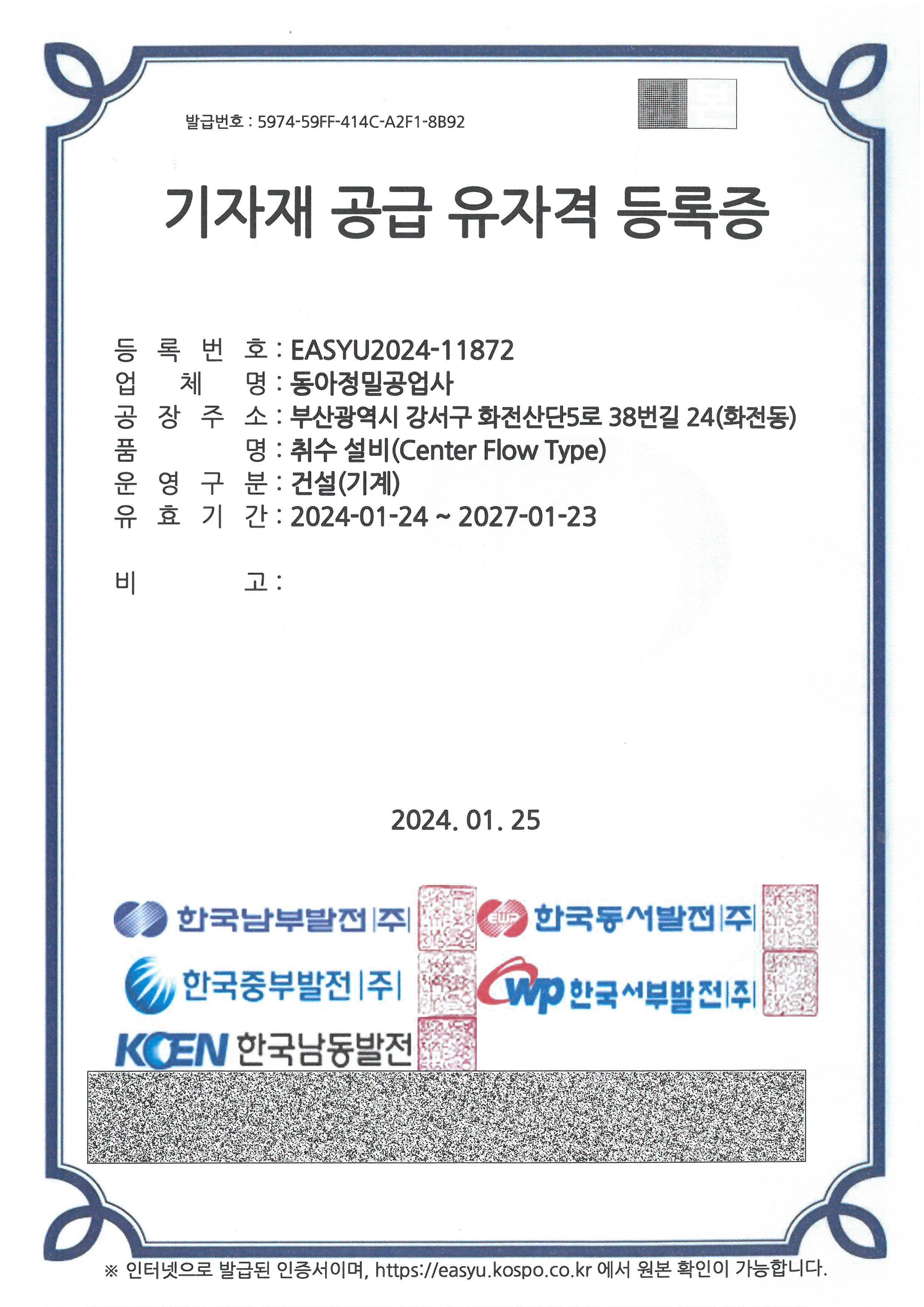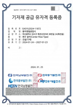 기자재공급유자격등록증(취수설비 CENTER FLOW TYPE)