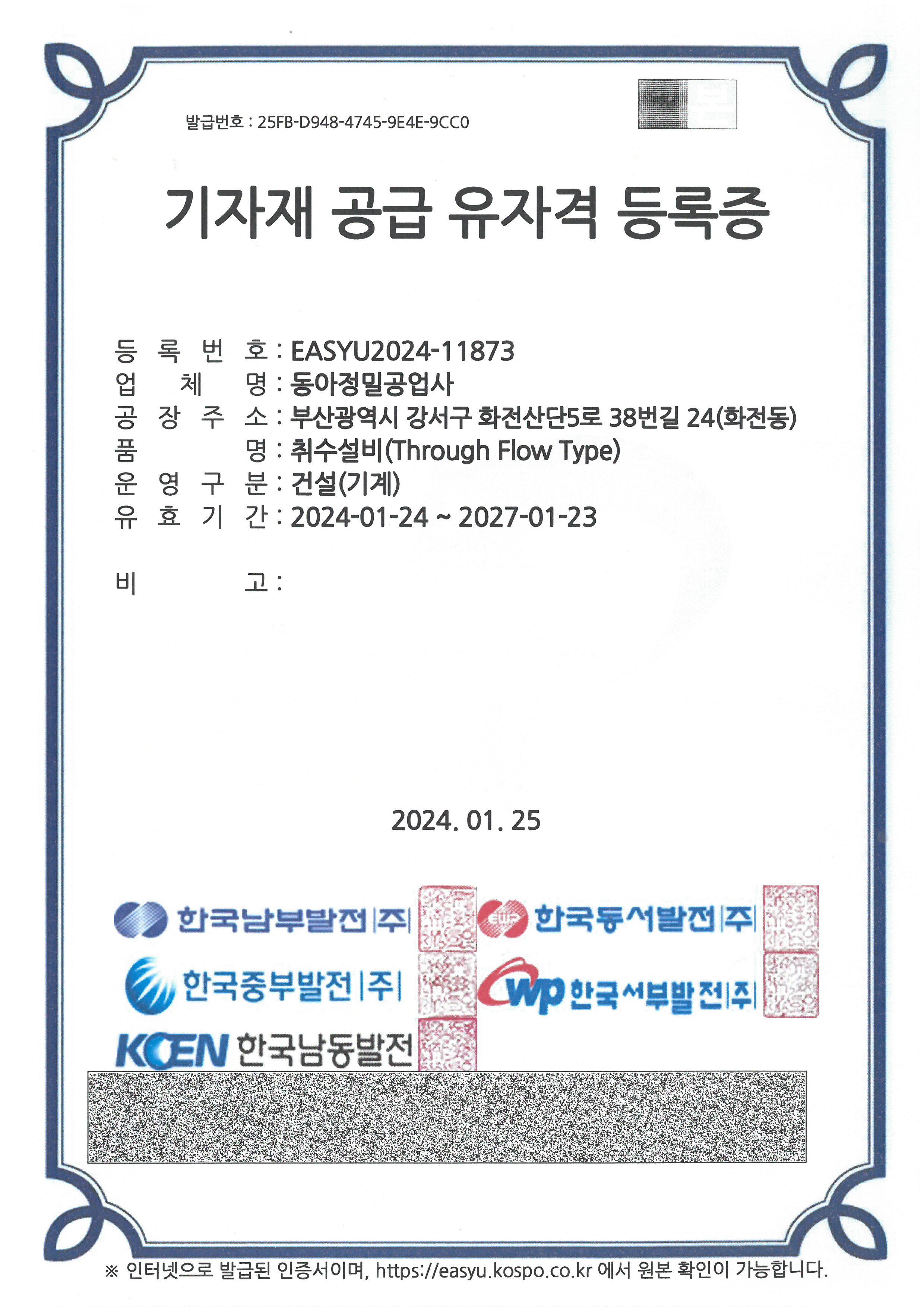 기자재공급유자격등록증(취수설비 THROUGH FLOW TYPE)