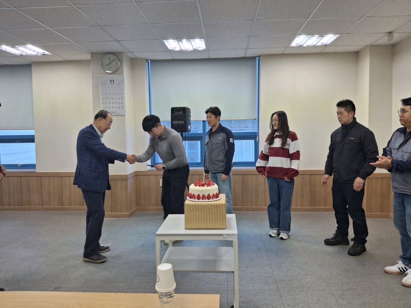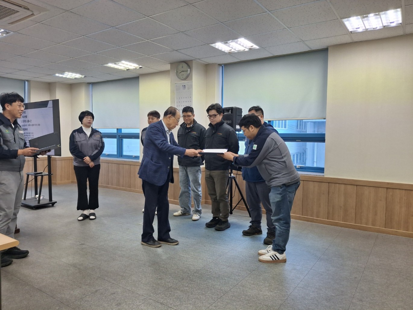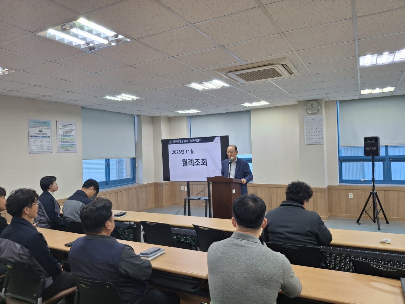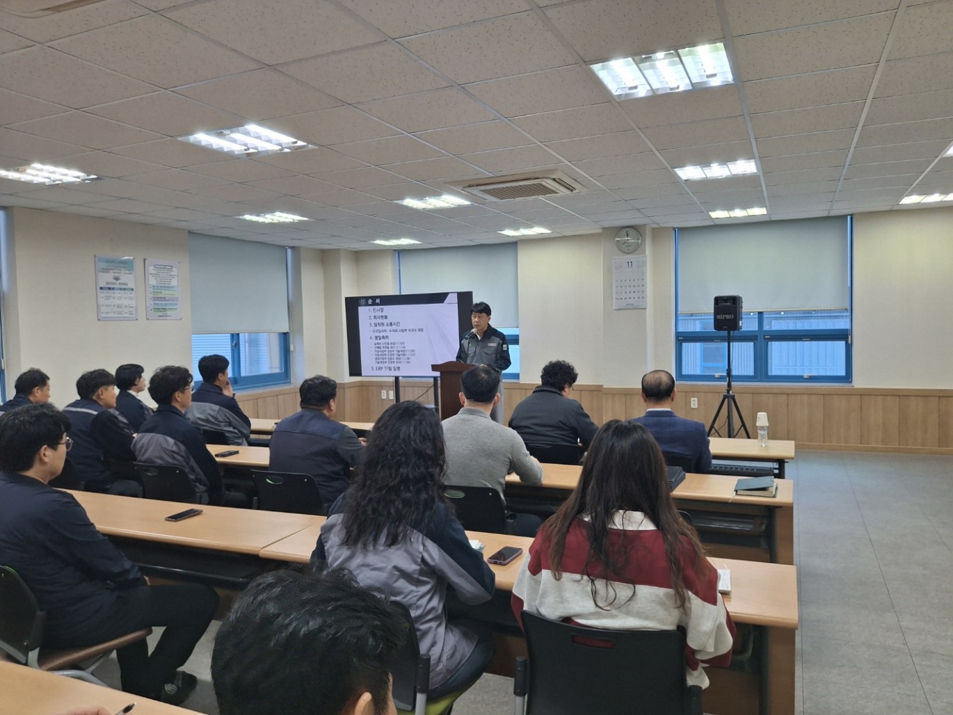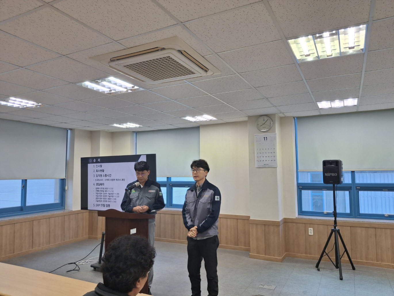 11월 월례조회 페이지 정보 작성자 Admin 작성일25-11-19 11:05 이전글 다음글 목록 본문 <행사순>1. 인사말 2. 회사현황 3. 신규입사자 소개4. 생일축하5. ERP TF팀 임명식 이전글 다음글 목록