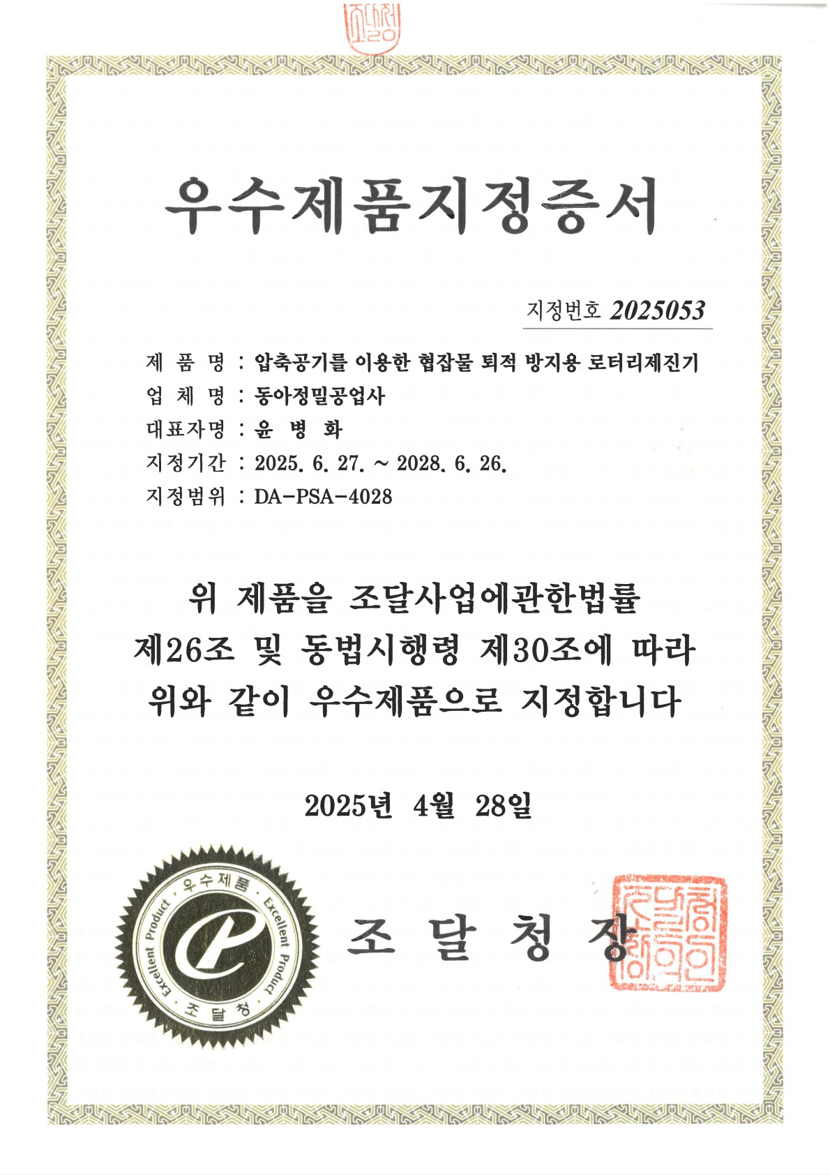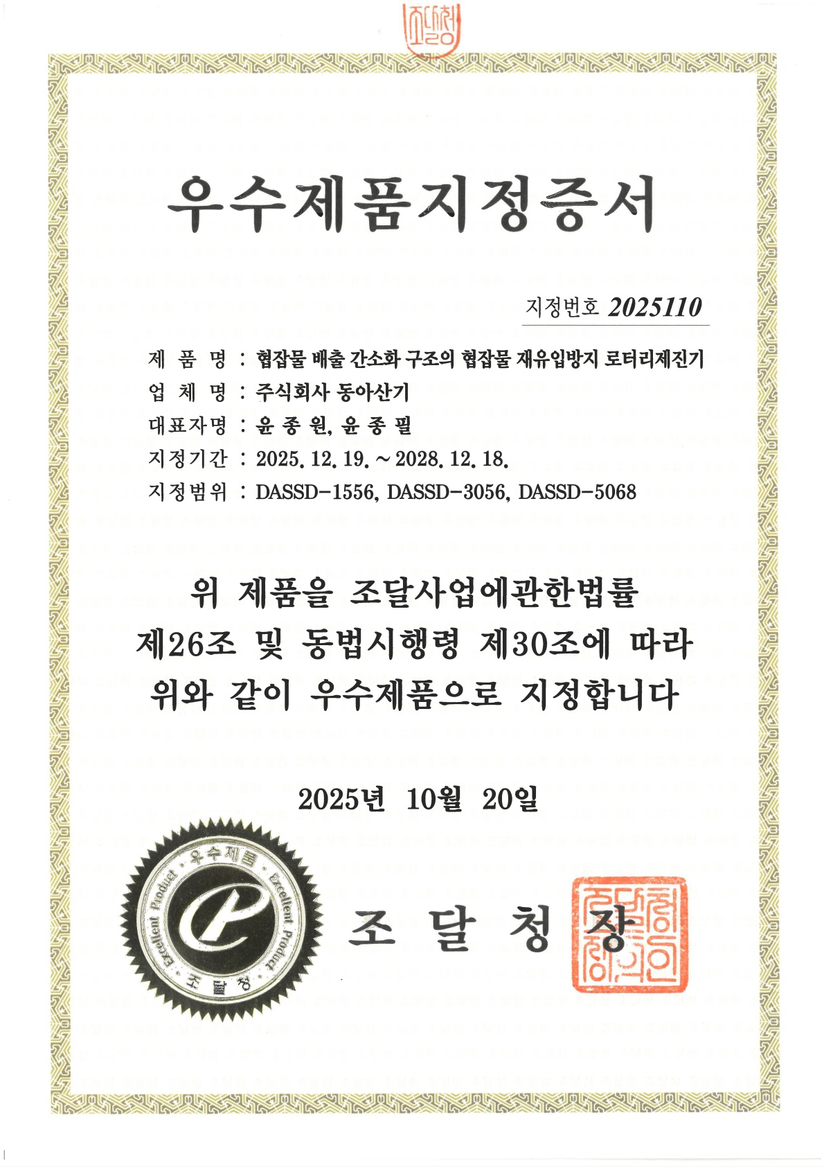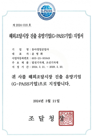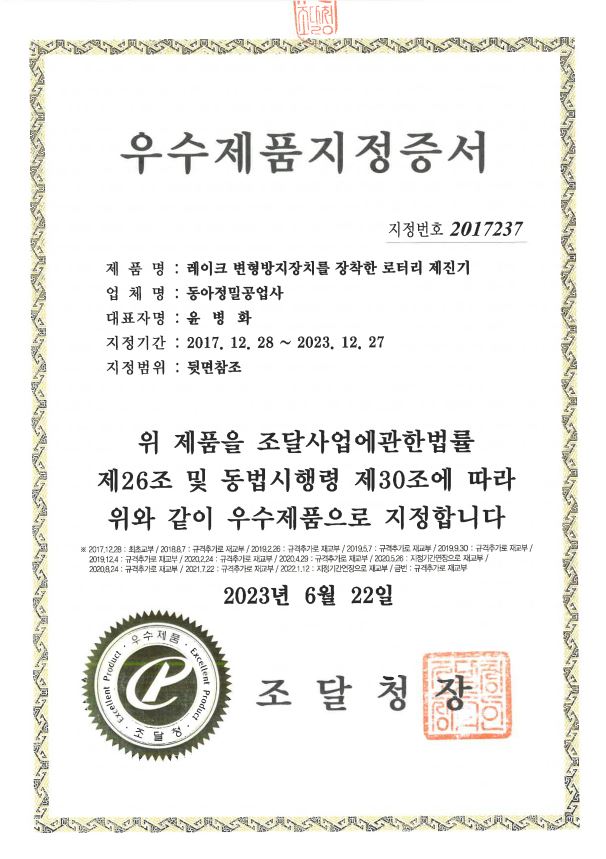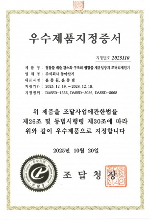 우수제품 지정증서_동아정밀