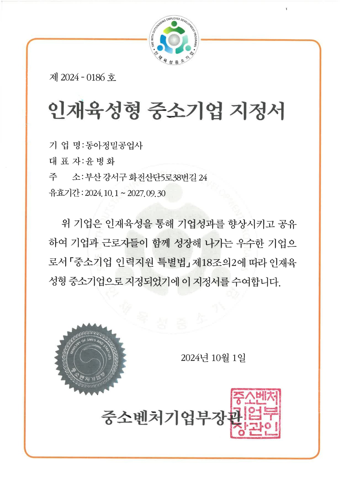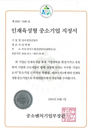 인재육성형 중소기업 지정서