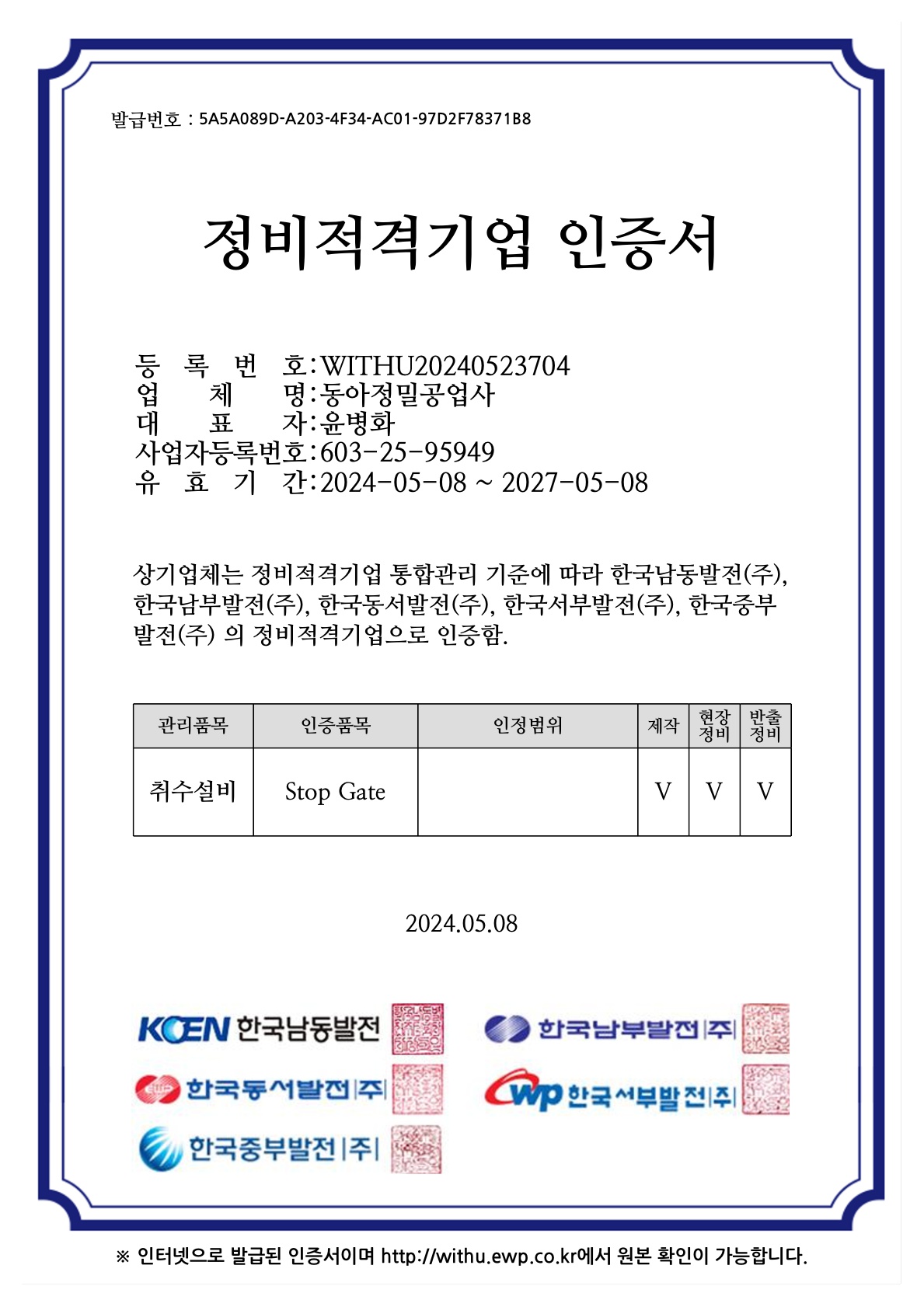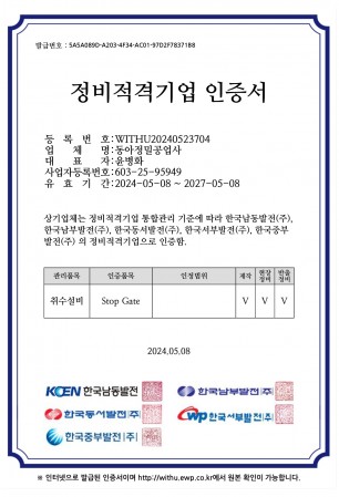 발전회사 정비적격기업 인증서_취수설비_Stop Gate