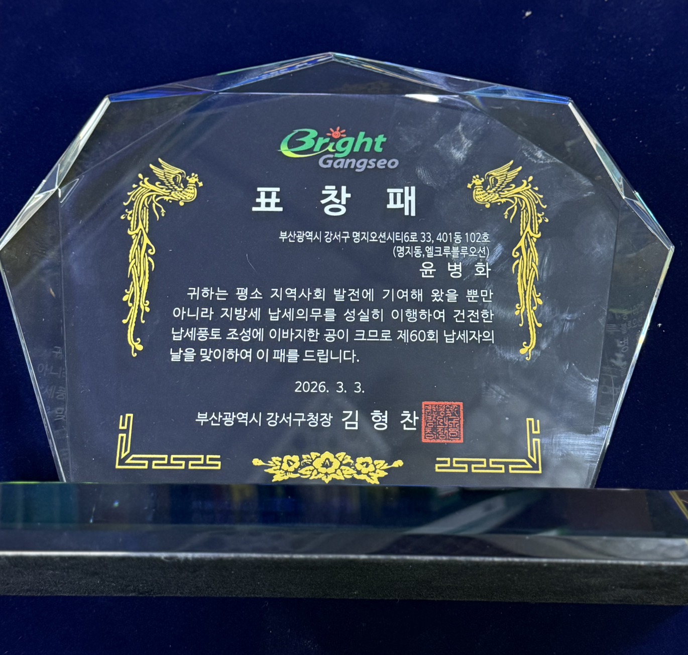 2026년 강서구청 "우수납세자" 표창장 수여 페이지 정보 작성자 Admin 작성일26-03-13 19:22 이전글 다음글 목록 본문 2026년 강서구청 "우수납세자" 표창장 수여2026.03.05 이전글 다음글 목록